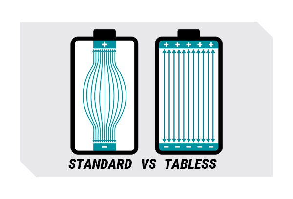 Diese Zellen der nächsten Generation, die ausschliesslich mit den BL4040F und BL4080H Akkus erhältlich sind, wurden mit modernster Technologie entwickelt. Tabless-Lithium-Ionen-Zellen eliminieren den Engpass, was eine wesentlich effizientere Methode der Energieversorgung ermöglicht. Tabless-Zellen vermeiden die Stromkonzentration, indem sie das vollständige Ende der Elektrode mit dem Ende der Zelle verbinden, anstatt mit den Laschen. Dies verbessert die Effizienz des Akkus, das Wärmemanagement und seine Gesamtleistung.