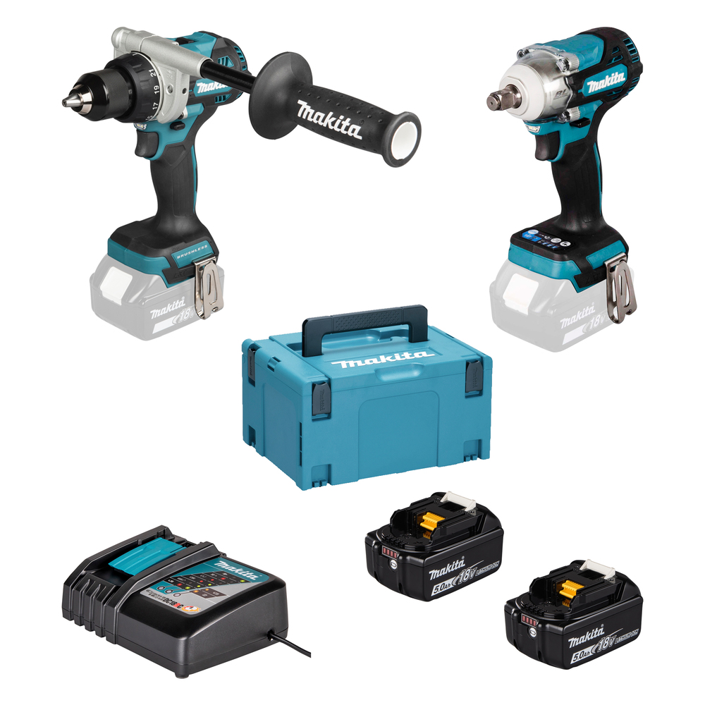 1x Bohrschrauber DDF492Z, 1x Schlagschrauber DTW300Z, 2x Akkus BL1850B 5.0 Ah, 1x Ladegerät DC18RC, 1x Makpac-C