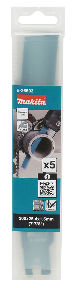 Sägeblatt für Säbelsägen zum Schneiden von Metall, Gusseisen und CML-Gusseisenrohren. Das dicke und robuste Sägeblatt ist speziell für den Einsatz mit Säbelsägen mit Kettenzug konzipiert. Die gebogene Form ermöglicht hohe Schnittgeschwindigkeiten. Das Diamant-Sägeblatt hat eine Gesamtlänge von 200 mm und eine Arbeitslänge von 172 mm. Die Blattstärke beträgt 1,5 mm. Die Packung enthält 5 Sägeblätter.